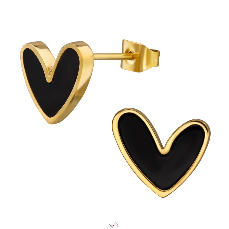 Black Colored Heart, Ear Studs, (316L Surgical Grade Stainless Steel, ,IP/PVD Gold Plated, Wholesale Jewellery, Eshop
