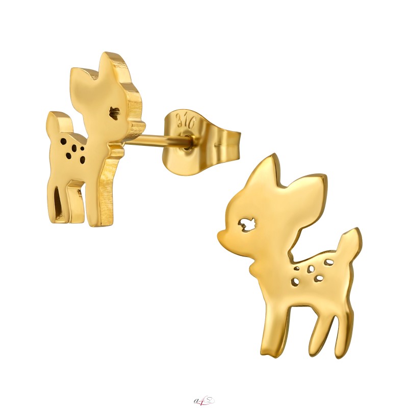 Deer, Steel Ear Studs, 316L Surgical Grade Stainless Steel,IP/PVD Gold Plated, Stainless Steel, Wholesale Jewellery, Eshop